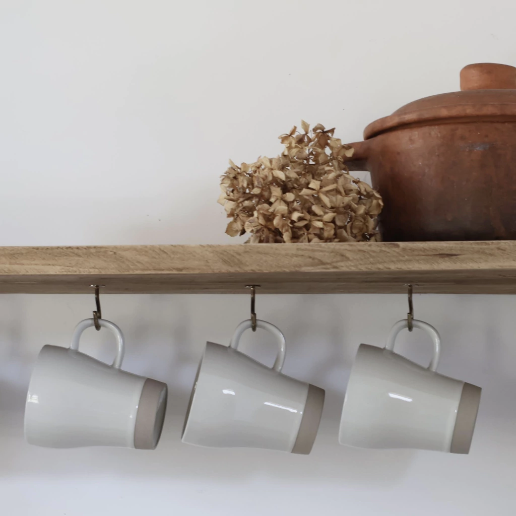 Descubre nuestra mug de cerámica color visón claro, que se distingue por su esmaltado brillante y un detalle en símil gres color visón más oscuro en la base, de otra textura diferente y terminación mate.